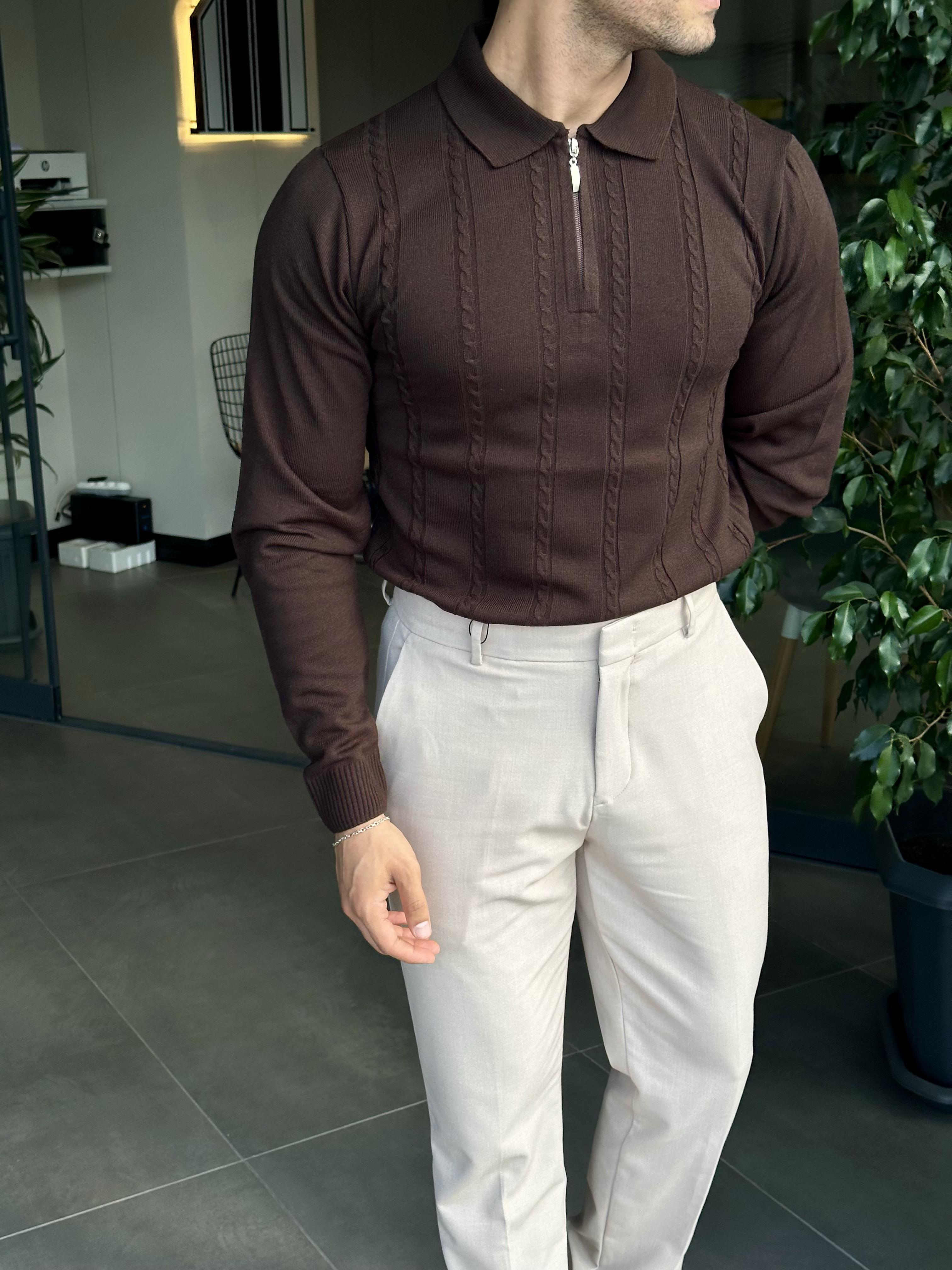 Zincir Desen Fermuarlı Pamuklu Kahve Triko